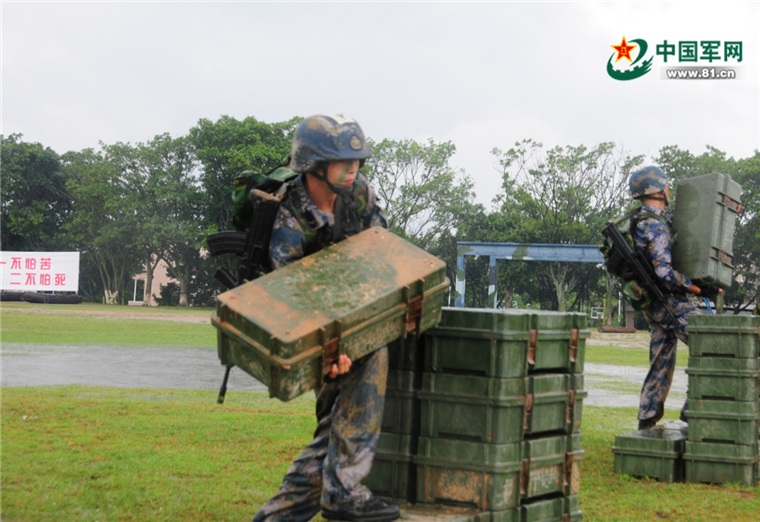 官兵正在扛弹药箱。