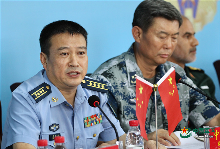 空军参谋部训练局副局长蒋明球大校在发布会上介绍本次承办赛事情况。(中国军网记者 张涛摄)