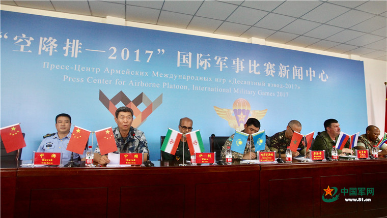 空降兵某军副军长景涛少将在发布会上介绍参赛准备情况。(中国军网记者 张涛摄)