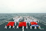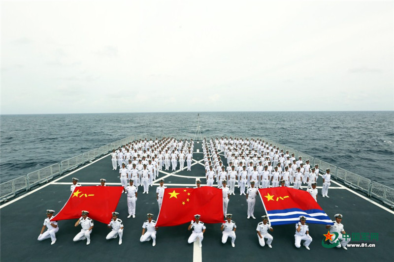 戚继光舰出访官兵代表拼成“中国”二字,在远海大洋祝福祖国生日快乐。中国军网记者乔梦摄