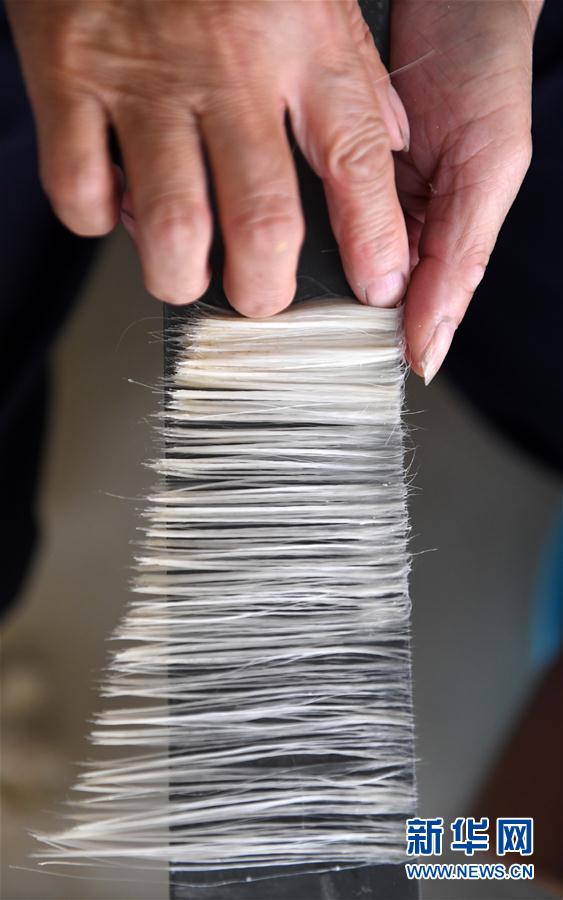 在广西宾阳县宾州镇,65岁的大罗村毛笔老工艺人罗儒供在齐毛作笔头(4月21日摄)。新华社记者 陆波岸 摄