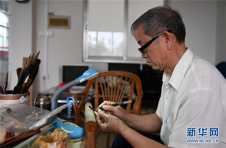 在广西宾阳县宾州镇,65岁的大罗村毛笔老工艺人罗儒供在雕刻笔管(4月21日摄)。