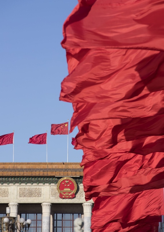 3月12日,十二届全国人大五次会议在北京人民大会堂举行第三次全体会议。这是天安门广场上红旗飘扬。新华社记者 费茂华 摄