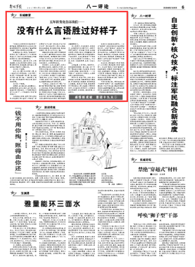 军人的样子,不仅是面子,更是里子,正所谓“形于外而修于内”。领导干部的“好样子”,并非朝夕而就,也非轻而易举,5年养心明志,5年践履笃行,强筋壮骨补足了精神之钙,务军备战强化了担当素质,正风反腐保持了干净纯洁,厉行法治做到了令行禁止。可以说,这是一次脱胎换骨,也是一次浴火重生。