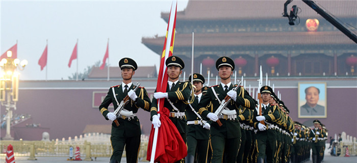 10月1日,国旗护卫队护送国旗走向升旗台。新华社记者 罗晓光摄