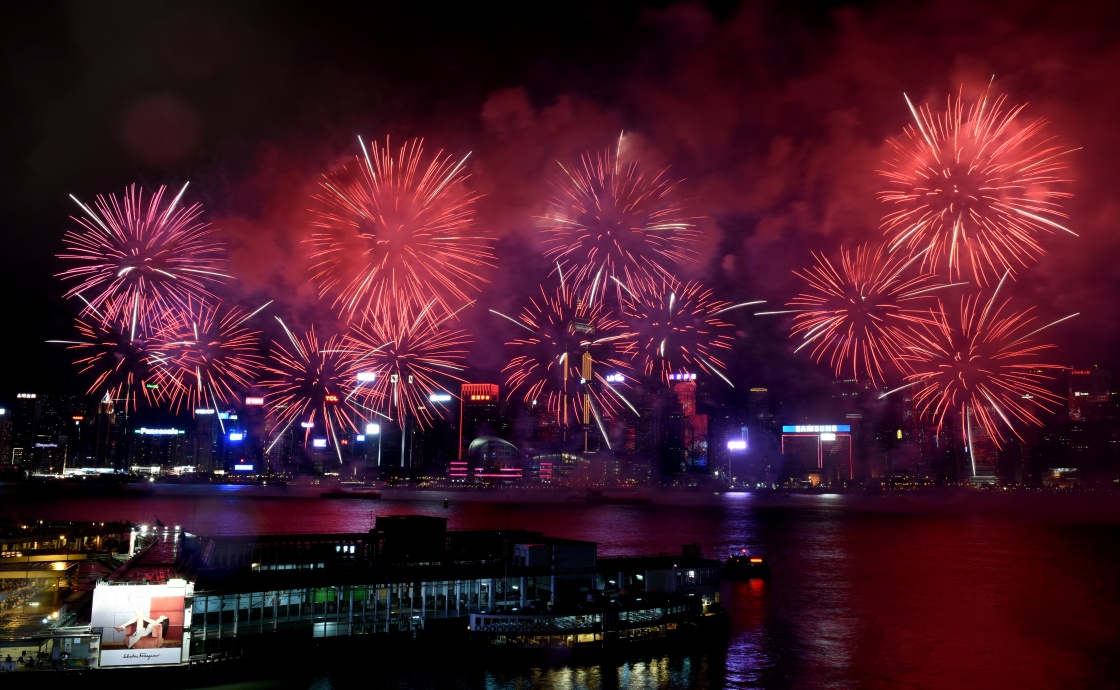 10月1日晚,香港维多利亚港举行国庆烟花燃放活动,庆祝中华人民共和国成立68周年。秦晴 摄
