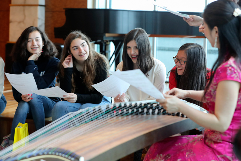 2017年5月5日,在中国驻美国纽约总领馆举行的“感知中国”活动中,一名老师为美国学生展示古筝弹奏。新华社记者 王迎 摄