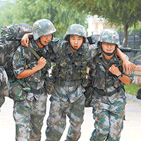 “坚持住!我们一起冲过去!”五公里武装越野中,某海防旅战士杨家富不小心崴脚了,战友们架着他一起跑到终点。于俊楠 摄