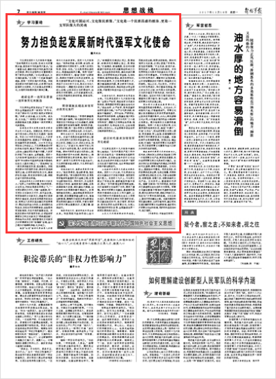 习主席在党的十九大报告中强调:“没有高度的文化自信,没有文化的繁荣兴盛,就没有中华民族伟大复兴。”这一重要论述,着眼实现中华民族伟大复兴中国梦,将文化自信和文化繁荣提升到了新的历史高度。“文化兴国运兴,文化强民族强。”文化是一个民族强盛的根脉,更是一支军队强大的灵魂。请关注今日《解放军报》刊发的理论文章——