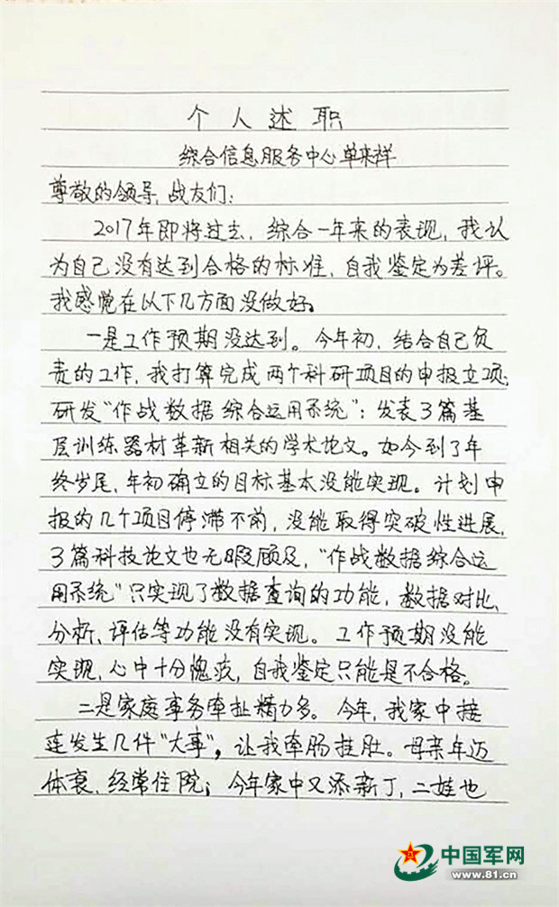 他一边劝解前来“诉苦”的位大力,一边从心里又对这个老同事、老战友多了一份敬重和佩服:“这份勇气和坦荡,值得我向他学习。”在单来祥的坚持下,这份自评为“不合格”的年终述职材料交到了旅里。