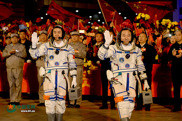 2016年10月17日凌晨4时40分许,神舟十一号与天宫二号载人飞行任务航天员乘组出征仪式在酒泉卫星发射中心问天阁圆梦园广场举行。解放军报记者 岱天荣 摄