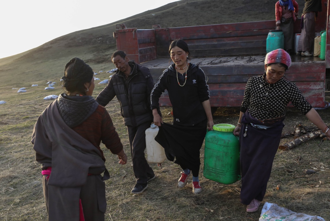 在若尔盖县辖曼镇河拉村,藏族牧民从卡车上搬运生活用水。这些生活用水是卡车从三公里外取来,每天来回两趟(5月11日摄)。