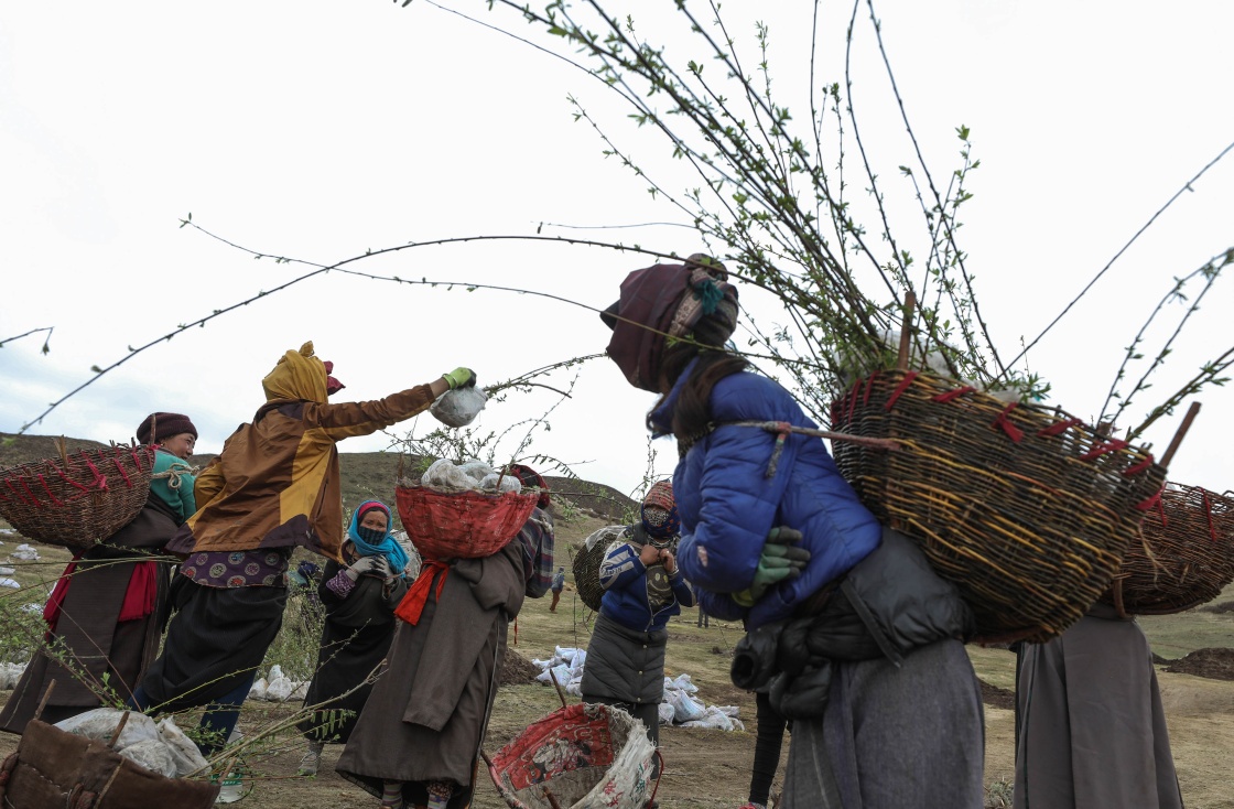 在若尔盖县辖曼镇河拉村,藏族牧民在往背篓里装高原柳。这些高原柳由提高成活率的营养液包裹(5月12日摄)。