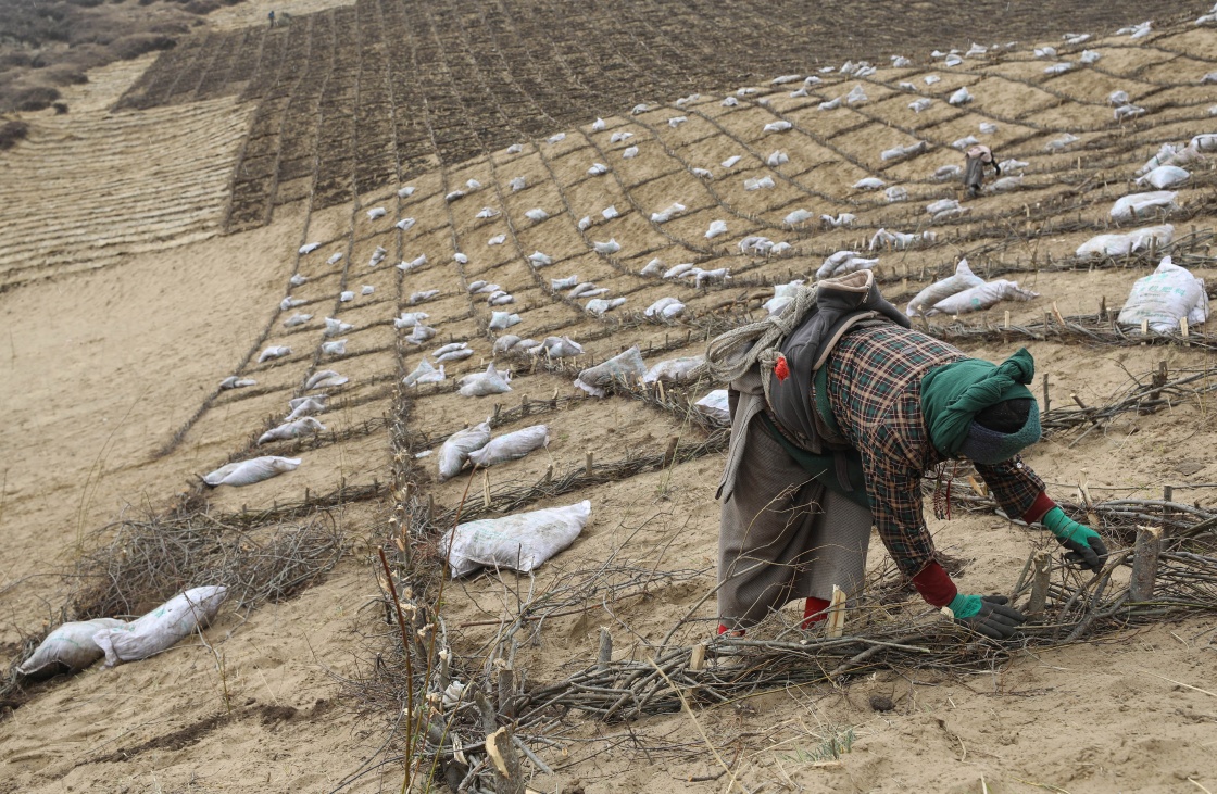 在若尔盖县辖曼镇河拉村,一位藏族牧民用高原柳枝编制沙障(5月11日摄)。