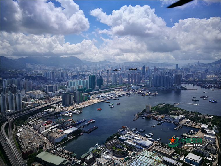 6月6日,驻香港部队“惠州舰”“钦州舰”和3架直升机,在香港特别行政区海上和空中进行联合巡逻。(资料图)