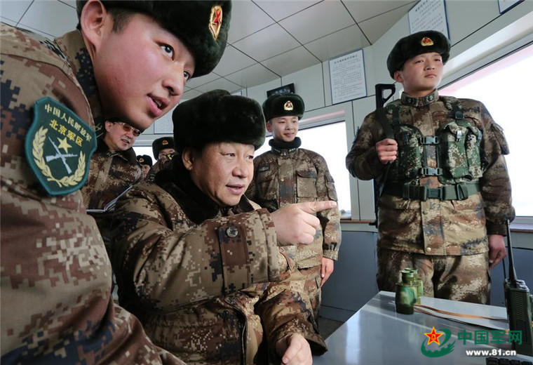 2014年1月26日,中共中央总书记、国家主席、中央军委主席习近平冒严寒踏冰雪,来到内蒙古军区某边防团三角山哨所,看望执勤的战士。解放军报记者 周朝荣 摄