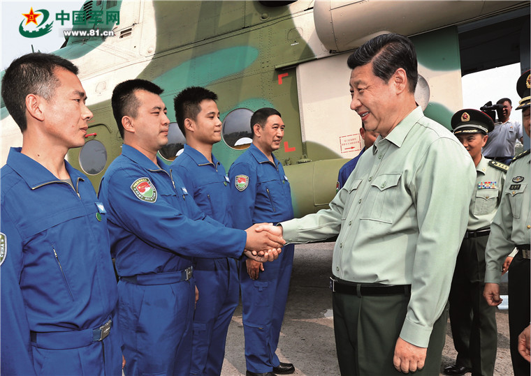 2013年5月22日下午,中共中央总书记、国家主席、中央军委主席习近平特地来到原第13集团军某陆航旅视察。得知4月20日年轻飞行员张尚年在芦山地震发生后立即中断婚礼,赶回部队参加抢险救灾,习近平叮嘱他要抓紧把婚礼办了。 解放军报记者 周朝荣 摄