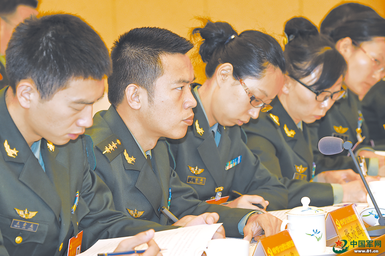 代表们认真讨论大会报告。解放军报记者 冯凯旋摄