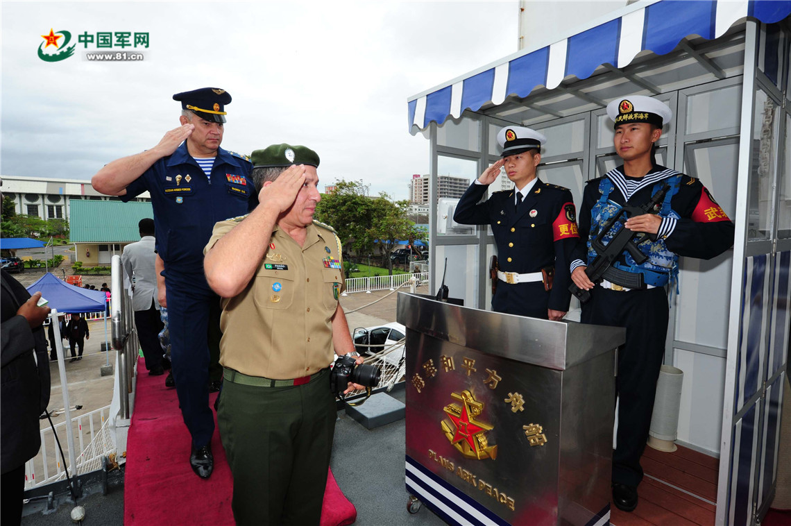 11月11日,驻莫桑比克武官团来和平方舟参观,图为巴西和俄罗斯武官登上和平方舟舷梯口。刘洋 摄