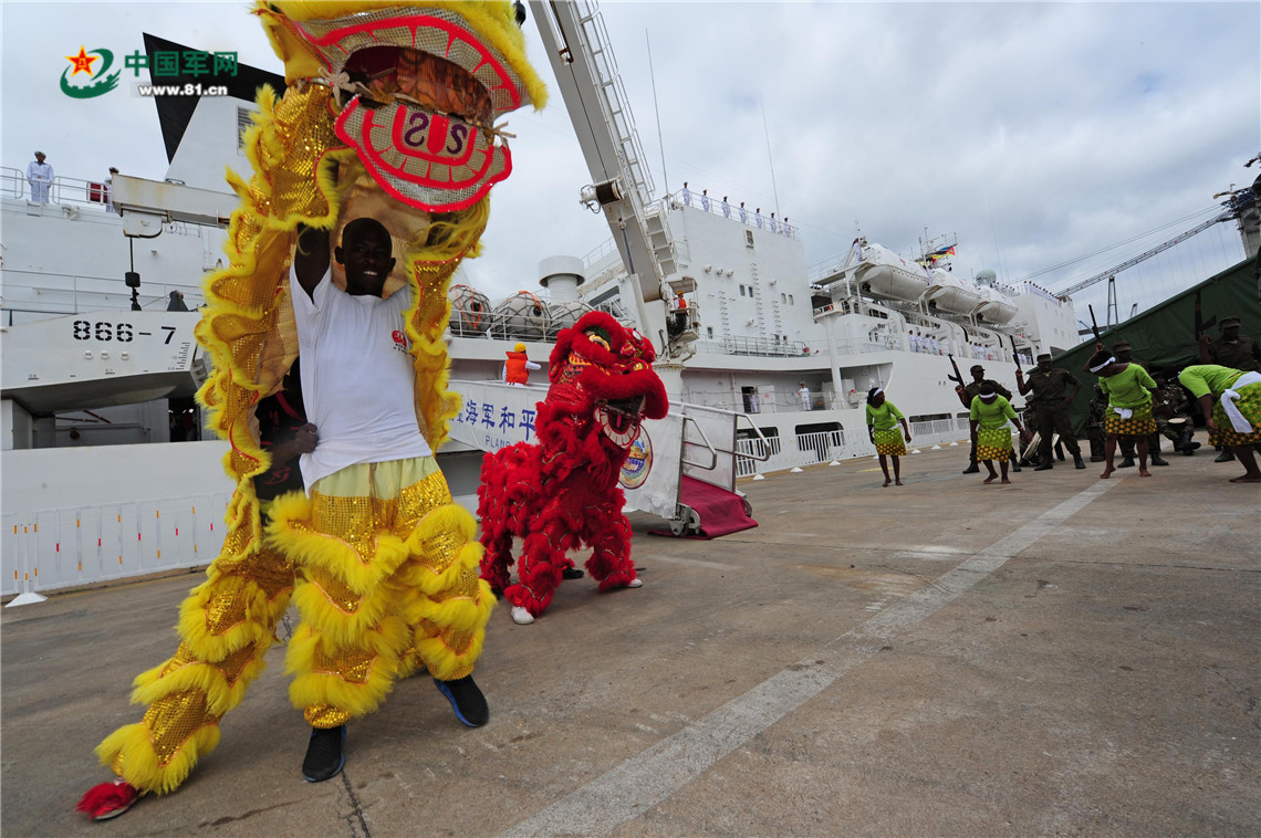 11月14日,在马普托港码头,莫桑比克民众舞动中国舞狮欢送中国海军和平方舟医院船离开。