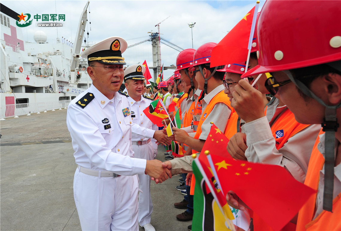 11月14日,在马普托港码头,“和谐使命-2017”任务指挥所领导与前来欢送的中资机构员工握手告别。