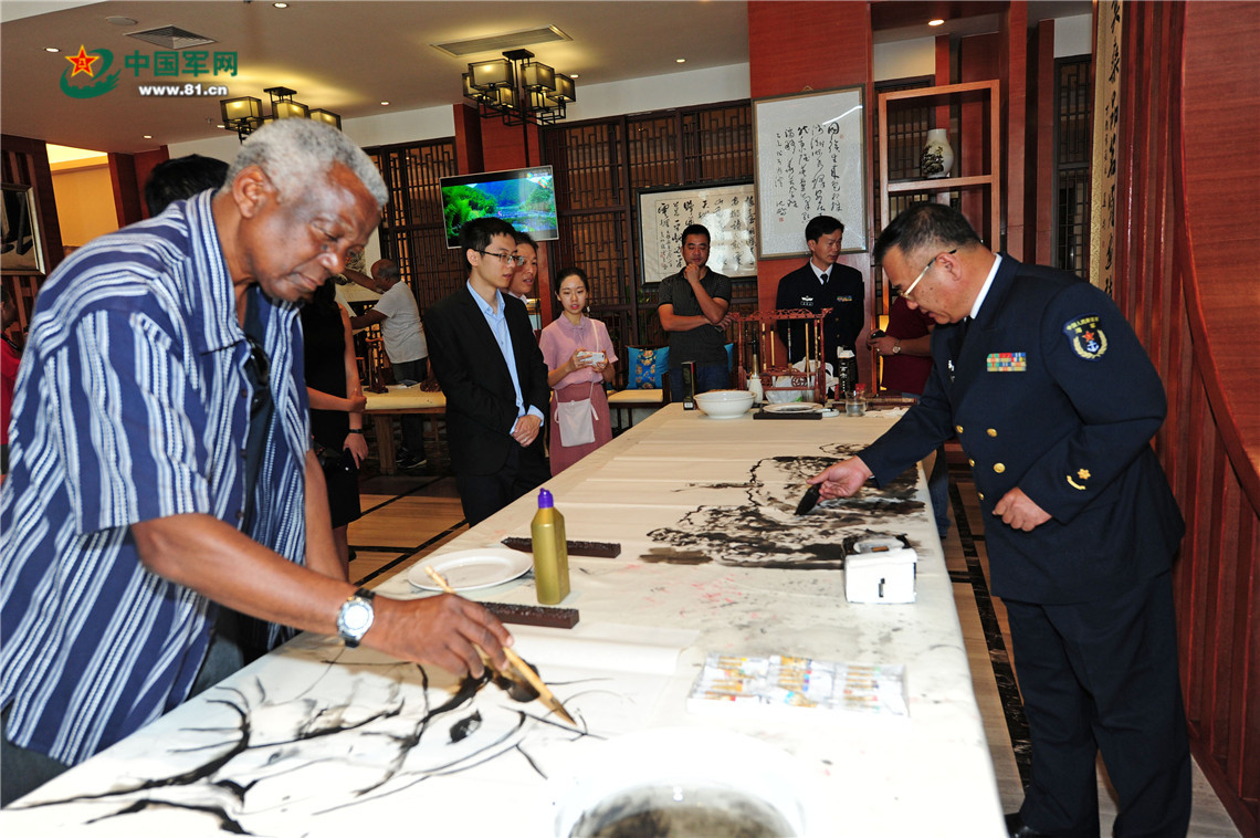 11月12日,任务官兵应邀与莫国家艺术中心的画家们开展文化交流活动,共绘中莫两国友谊画卷。