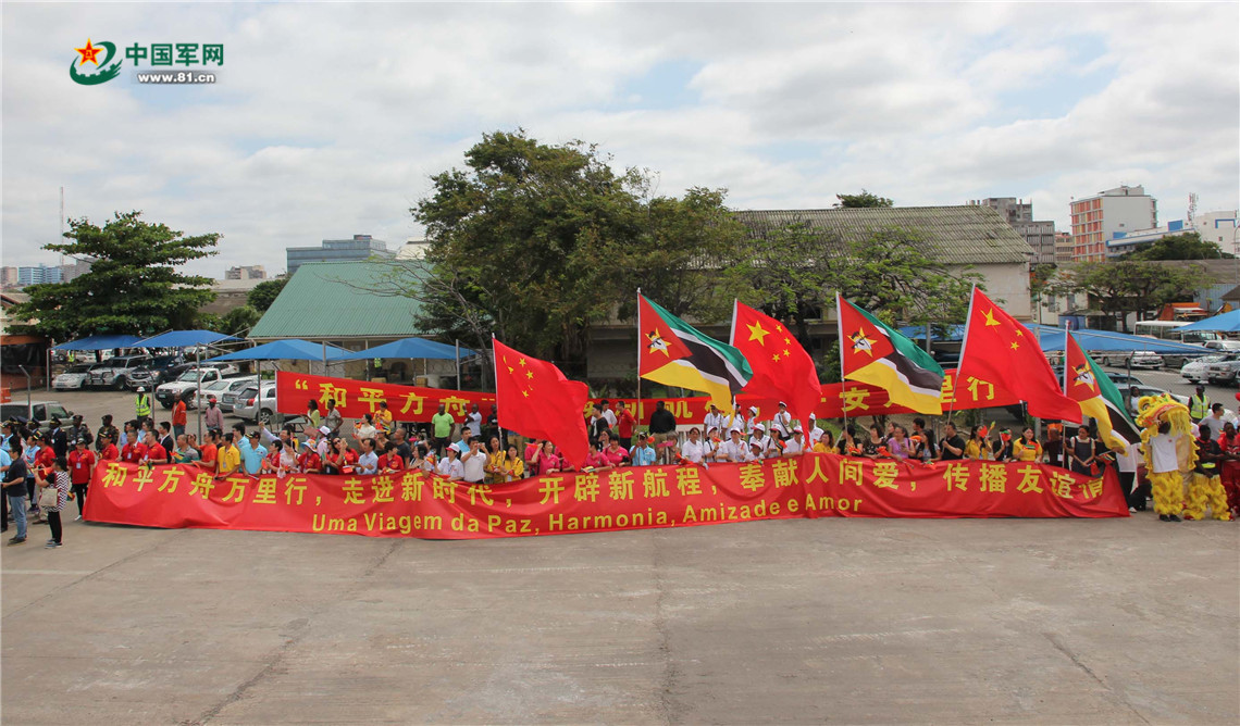 11月14日,和平方舟驶离莫桑比克马普托港,华人华侨打出“走进新时代 开辟新航程 奉献人间爱 传播友谊情”欢送横幅。刘洋 摄