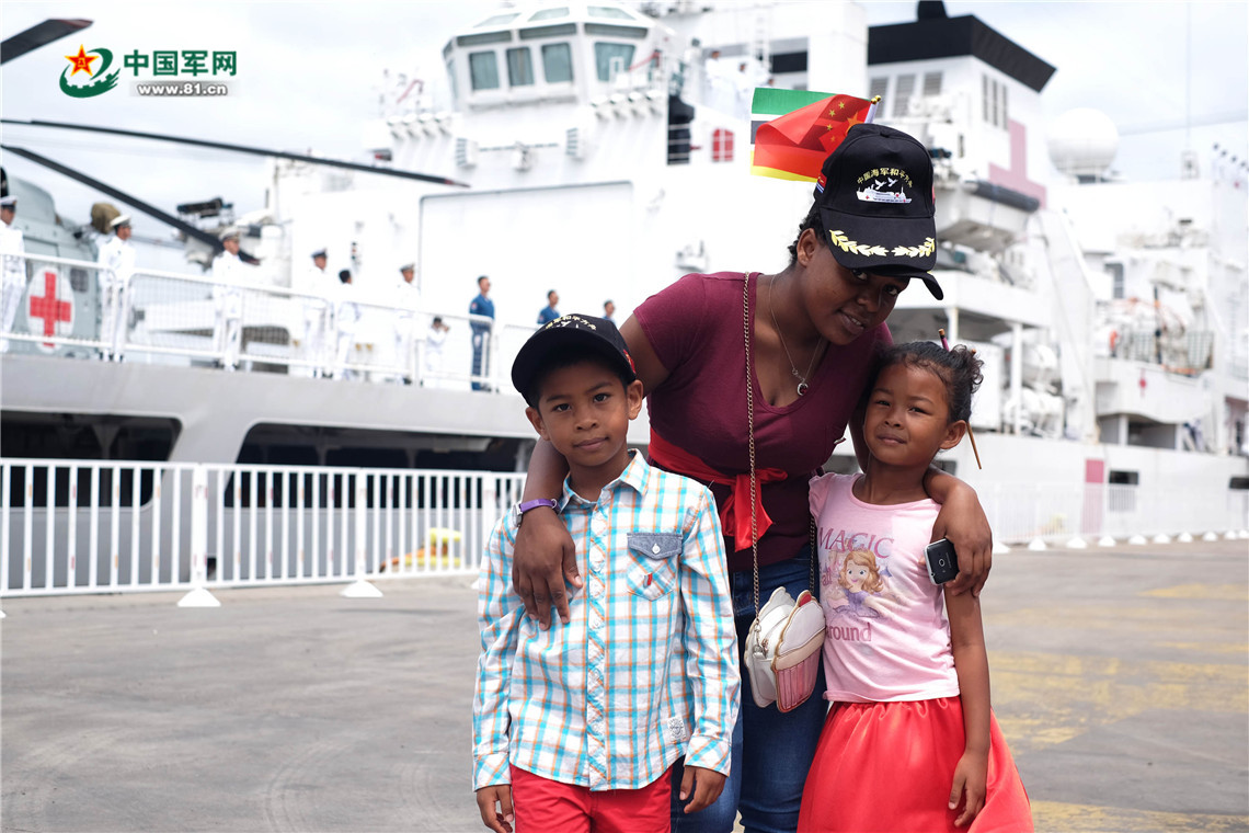 11月14日,在马普托港码头,一名莫桑比克妇女带着两个孩子依依不舍送别和平方舟医院船。