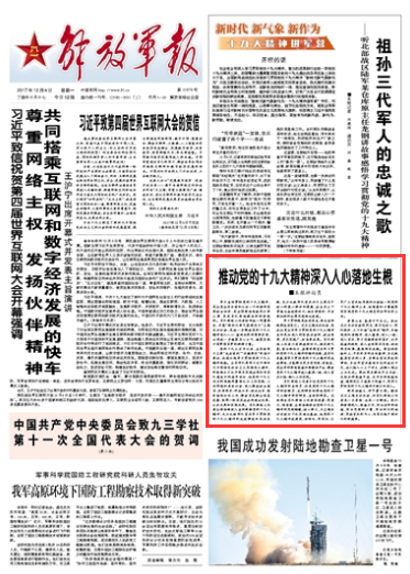 学习宣传贯彻党的十九大精神,是全党全军当前和今后一个时期的首要政治任务,是全国新闻战线的头等大事,更是军队新闻媒体的职责使命。今日出版的《解放军报》发表评论文章指出,军队新闻工作者按照统一部署要求,开展“新时代新气象新作为”主题采访活动,是进一步推动党的十九大精神深入人心、落地生根的重要实践,必将进一步凝聚军心士气,凝聚实现中国梦强军梦的磅礴力量。
