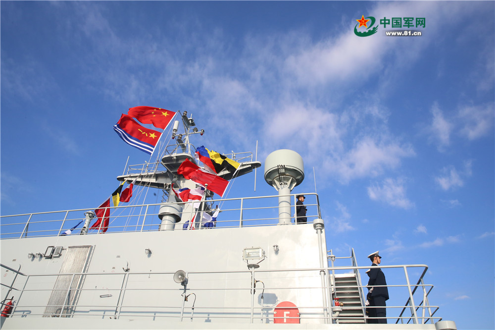 缓缓驶入祖国军港码头的戚继光舰上,五星红旗和海军军旗迎风招展。