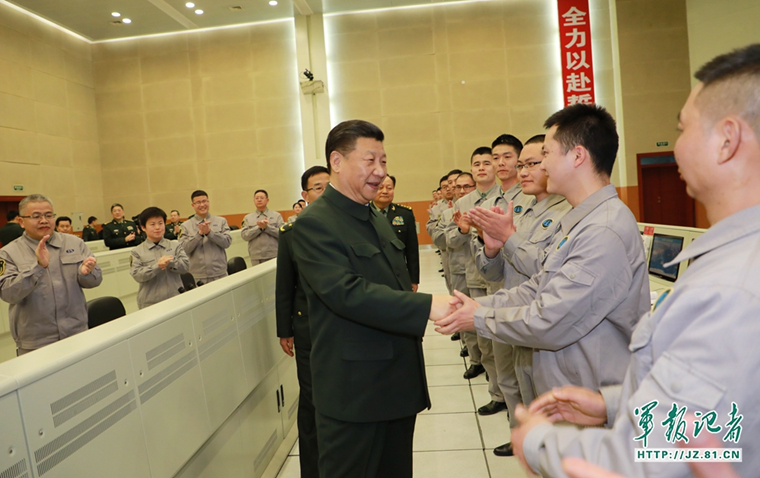 指挥大厅内,基地官兵正在紧张有序地忙碌着,习近平很关心北斗三号卫星发射任务准备情况,特意来到这里看望大家。看到习主席到来,大家非常激动,全体起立,报以热烈掌声。习近平同工位上的官兵一一握手,同科技人员亲切交谈,详细询问每名同志的科研工作和生活情况。听到大家扎根山沟、献身航天,取得多项发明专利,习近平露出赞许的目光。习近平了解了卫星发射准备工作,叮嘱大家保持精益求精的工作作风,确保万无一失。