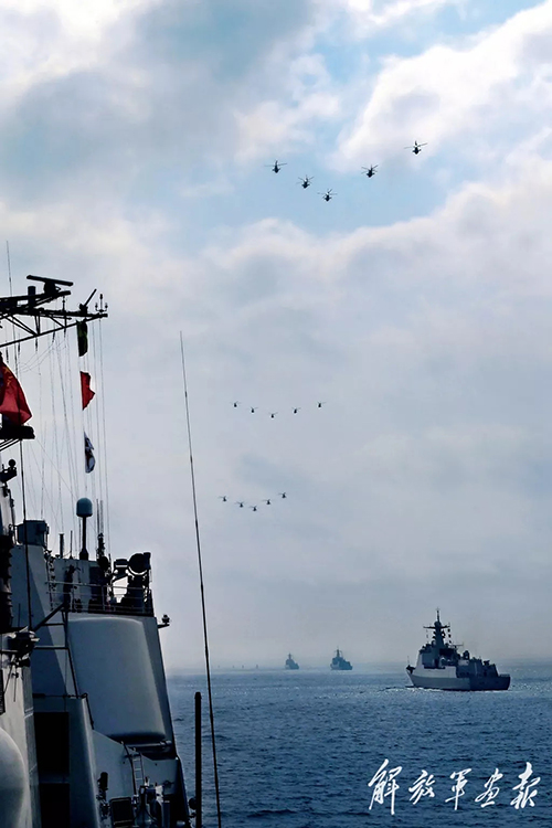 舰载直升机梯队在受阅舰艇编队上方凌空飞过。