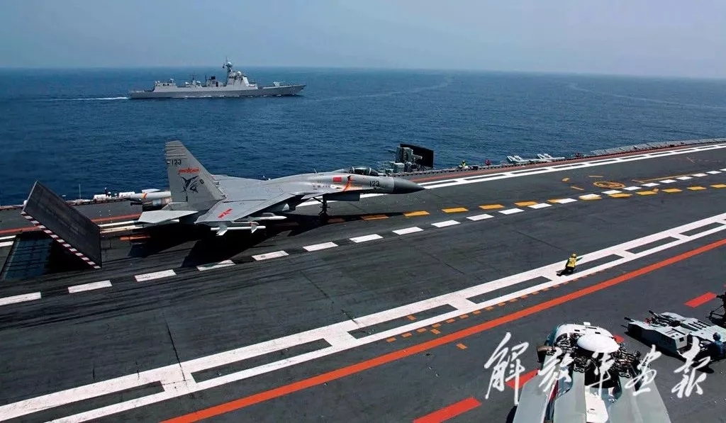 随着起飞指挥员的放飞手势,辽宁舰歼-15飞机滑跃起飞。