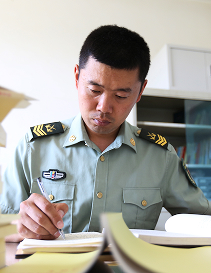 他始终把学习系列讲话作为精神支柱和灵魂根本,紧跟习主席思想步伐,坚持每天学习一段习主席重要讲话,采取观看半个小时电视新闻、阅看一个小时报刊、浏览一个小时学习类微信公众号的方式,点滴积累提升理论水平,熟悉他的人都知道,他经常浏览人民日报、军报记者、学习小组、中国战略支援等微信公众号,并将重点文章和学习体会转发到朋友圈;坚持每周拿出半天时间梳理学习情况、查找理论盲点,通过翻阅书籍、请教领导、查阅网络等形式,针对性解疑释惑;坚持每月拿出一天汇总理论热点难点,对习主席的一些重要论述反复学、深入学,月底整理一篇习主席系列重要讲话学习教育素材,为官兵上一堂理论教育课;坚持每年总结学习情况,查找问题不足,系统回顾当年习主席重要讲话,进行重读、品读、精读,切实领会精髓要义。