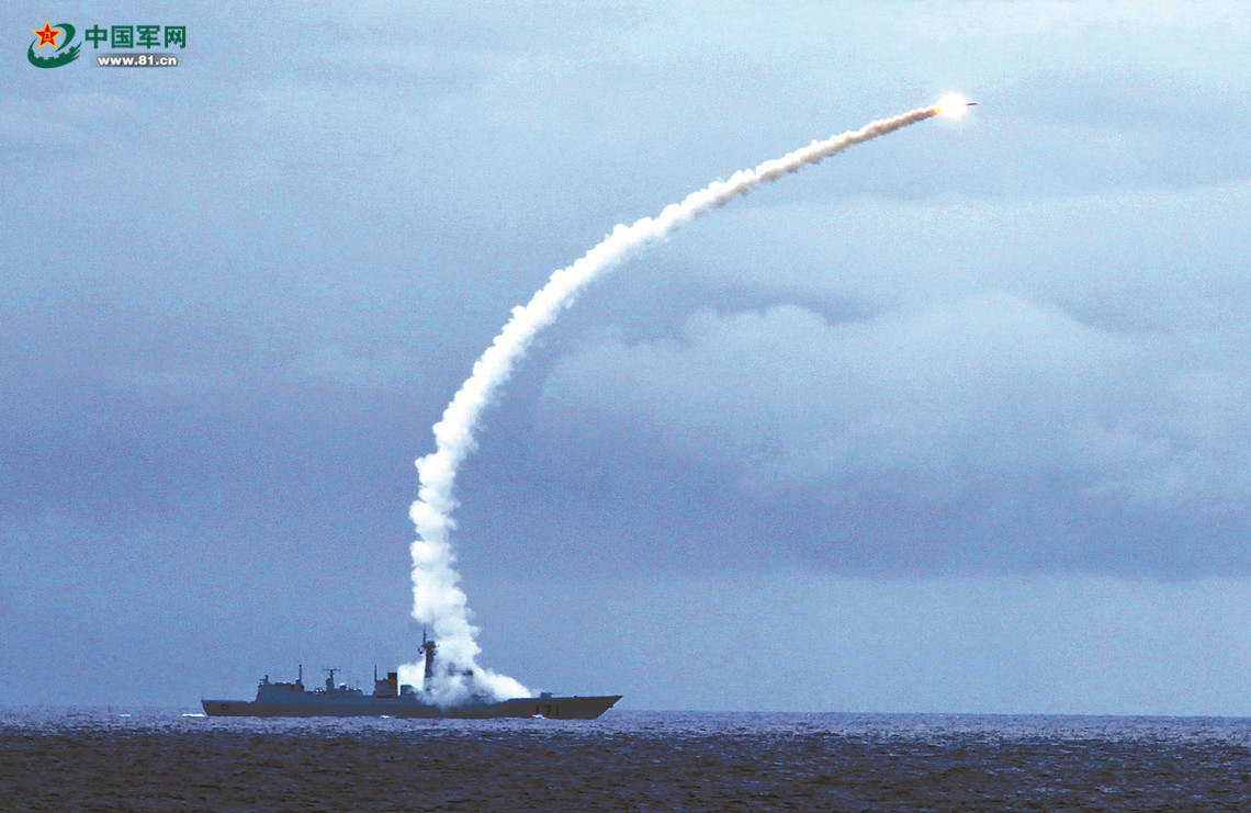 在实弹演习中,海口舰发射导弹对“敌”实施打击。