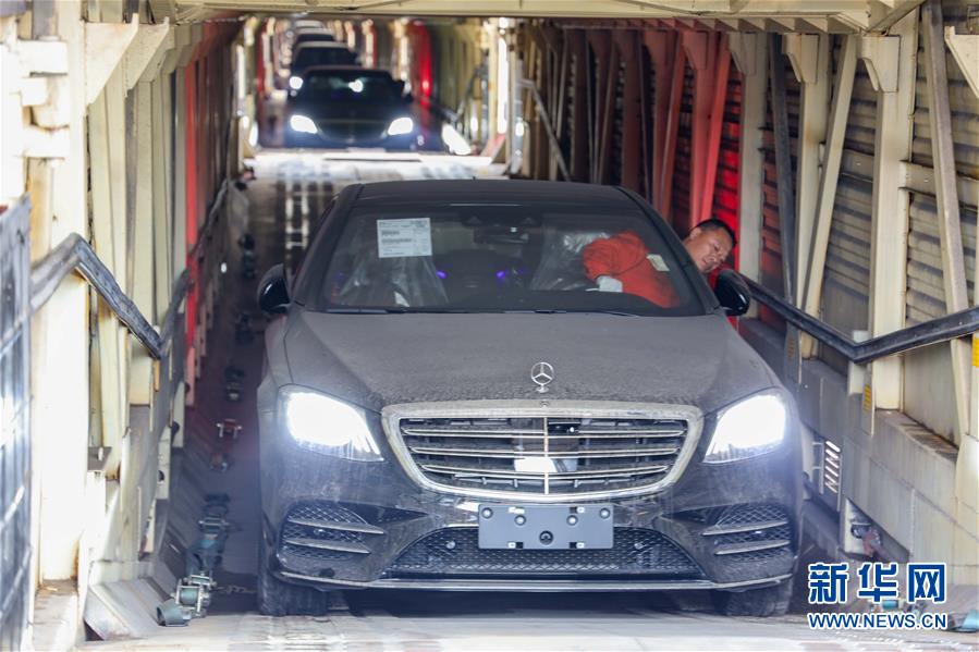 11月19日,在首趟中欧班列商品车专用车运输国际班列的车厢内,工作人员驾驶着进口整车进行卸货作业。 新华社记者 刘潺 摄