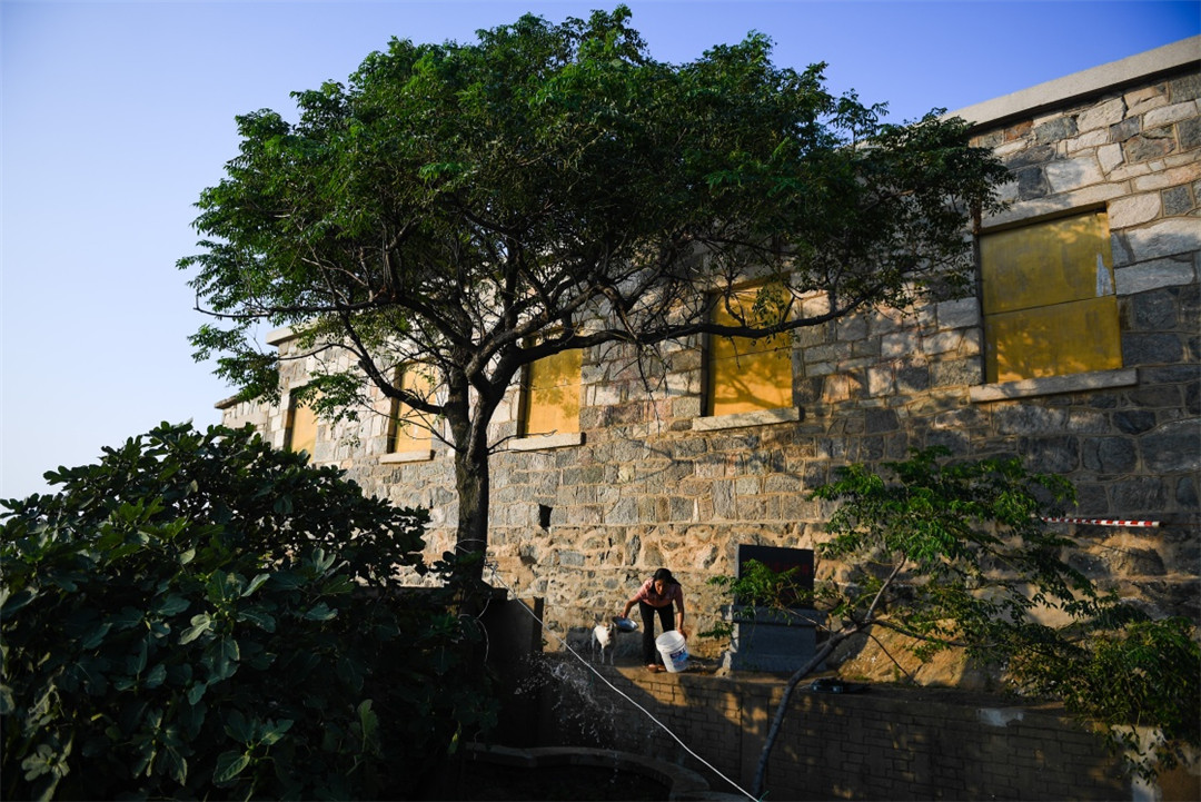 参加完丈夫王继才追悼会的王仕花乘船回到开山岛,给他俩种的苦楝树浇水(8月8日摄)。王仕花将继续守岛。新华社记者 李响 摄