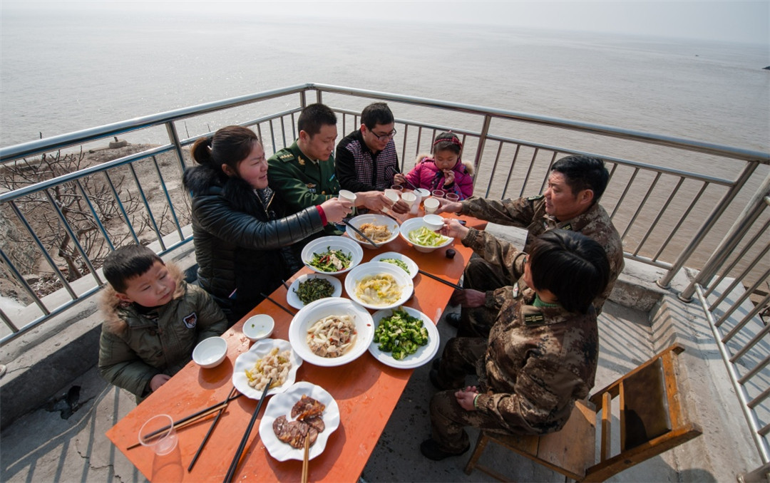 王继才夫妇的儿子王志国(左三)和姐姐一家在开山岛上和父母团聚(2015年2月13日摄)。新华社记者 李响 摄