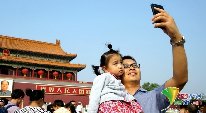 在天安门城楼前,父亲托起女儿,与天安门城楼拍合影。中国青年网记者 秦亮 摄