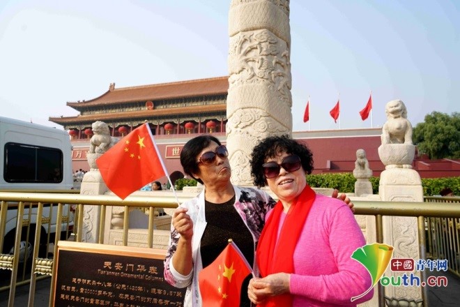 来自北京朝阳区十八里店两位可爱俏皮的阿姨。她俩相识四十多年,是初中同学,这次国庆结伴出游。她俩祝愿祖国母亲越来越繁荣,越来越好!中国青年网记者 秦亮 摄