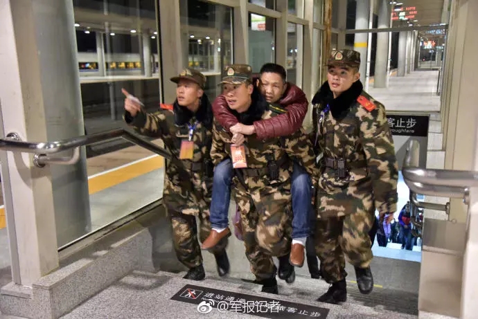 2月2日晚,在广东汕尾高铁站出现暖心一幕。在汕尾工作的程先生正准备乘坐动车赶往广州中转回湖北老家过年,却不料因着急赶路而失足摔倒,致使腿部受伤无法行走。几名武警战士一路将程先生送入站台并送进车厢入座,随后联络武警广州支队春运执勤官兵对程先生进行接力帮助,让程先生归家的计划不被耽误。(李曌阳、田星、王冰兵)