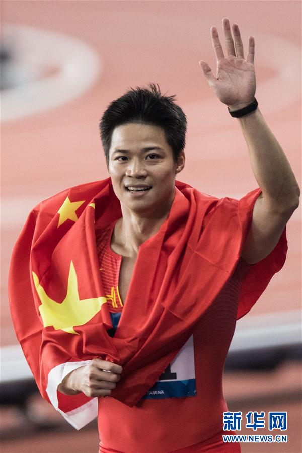 8月26日,中国选手苏炳添在比赛后庆祝。 当日,在第18届亚运会田径男子100米决赛中,中国选手苏炳添以9秒92的成绩获得冠军。 新华社记者吴壮摄