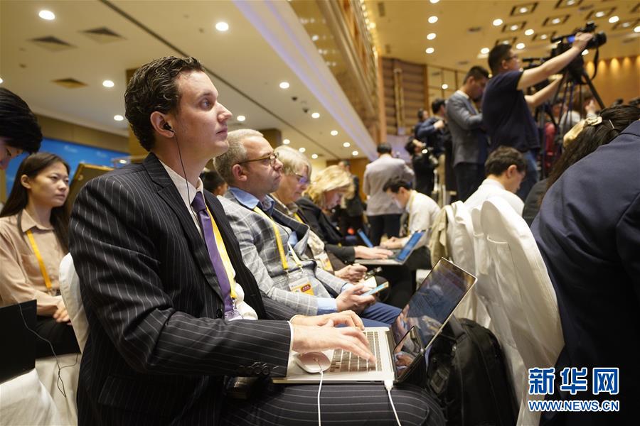 4月10日,媒体记者在博鳌亚洲论坛2018年年会开幕式上采访。博鳌亚洲论坛2018年年会于4月8日至11日举行,吸引众多媒体前来采访。新华社记者 邢广利 摄