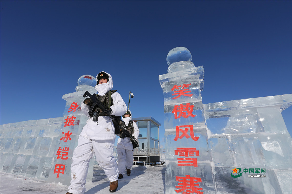 北部战区陆军某边防旅“黑河好八连”官兵冒着严寒进行边境封控演练。