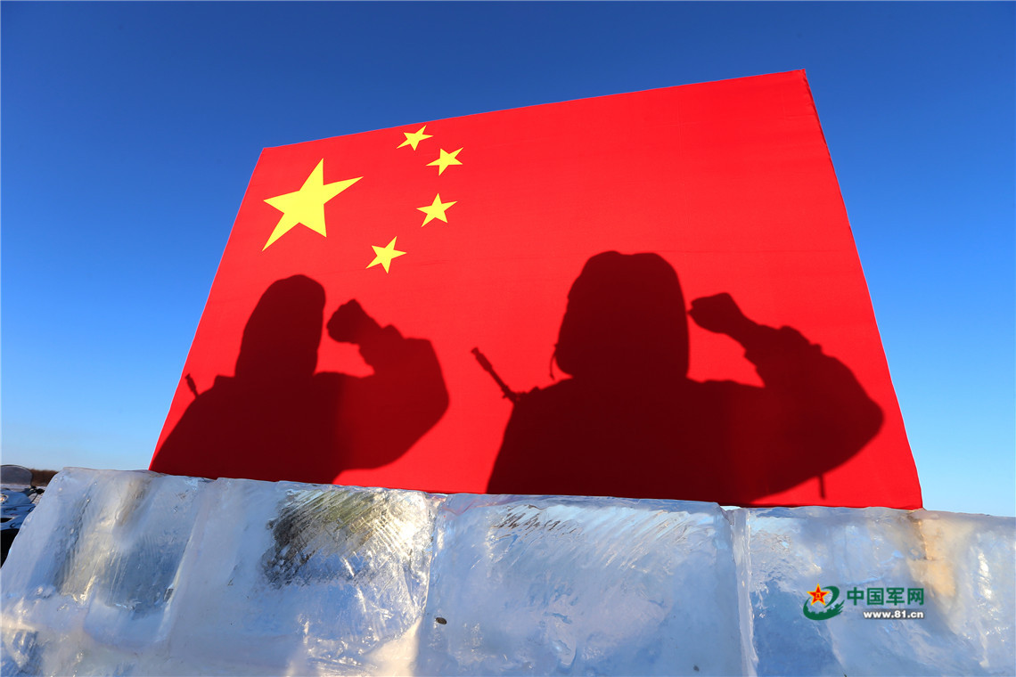 北部战区陆军某边防旅“黑河好八连”官兵冒着严寒进行边境封控演练。