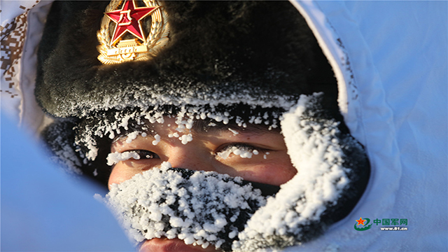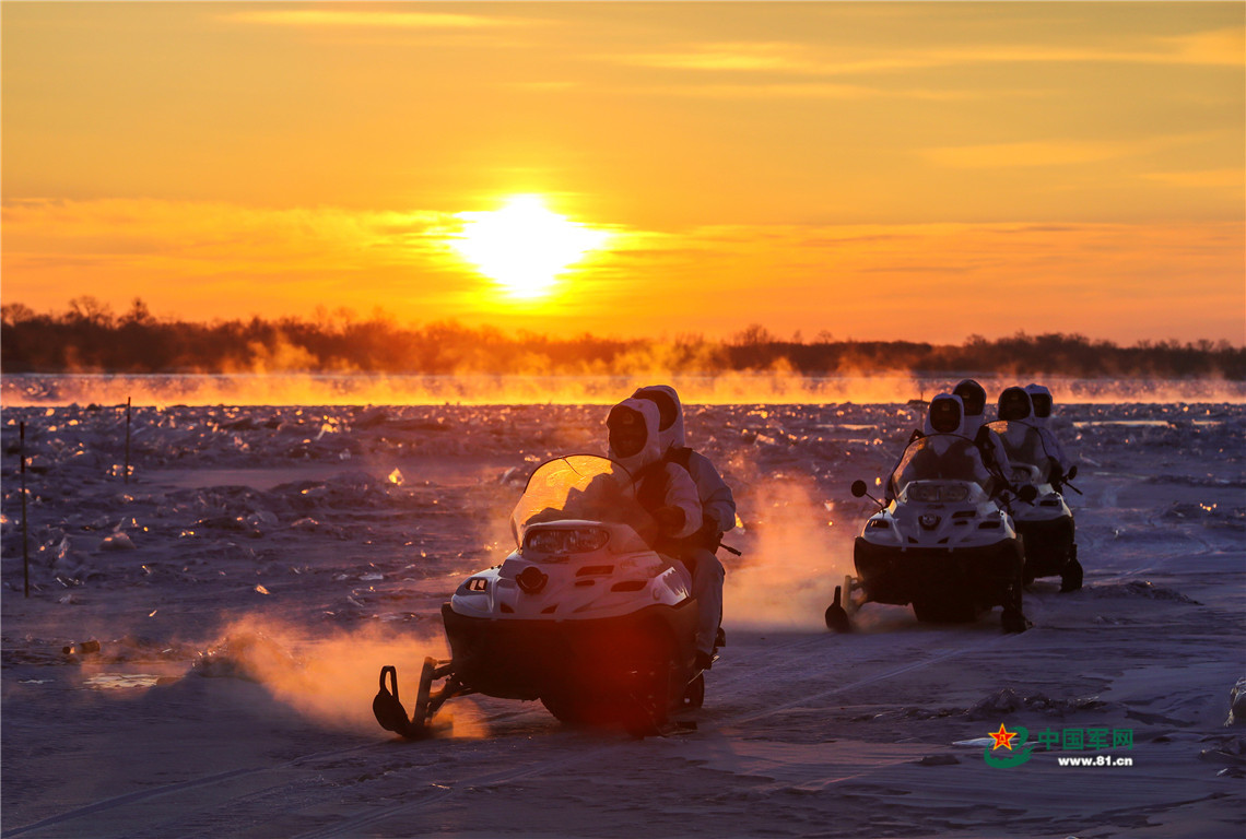 北部战区陆军某边防旅“黑河好八连”官兵冒着严寒进行边境封控演练。