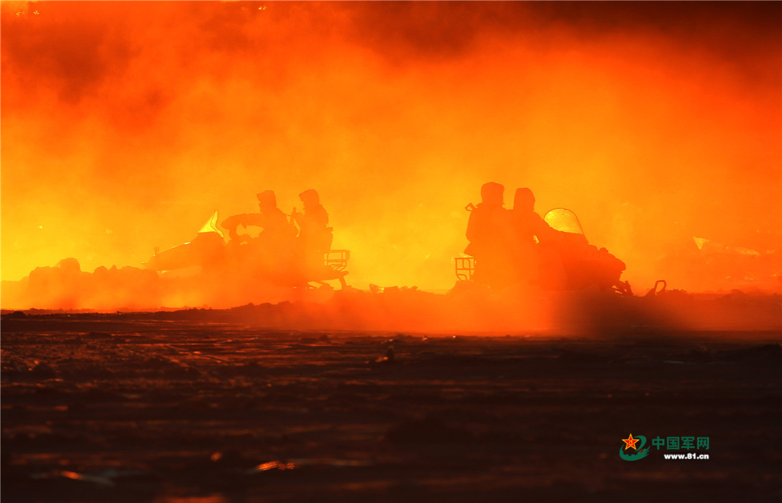 北部战区陆军某边防旅“黑河好八连”官兵冒着严寒进行边境封控演练。