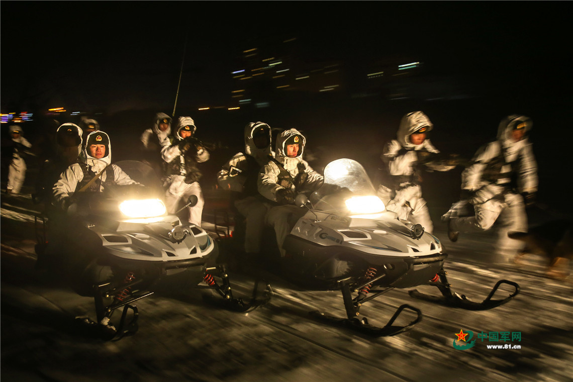 北部战区陆军某边防旅“黑河好八连”官兵冒着严寒进行边境封控演练。