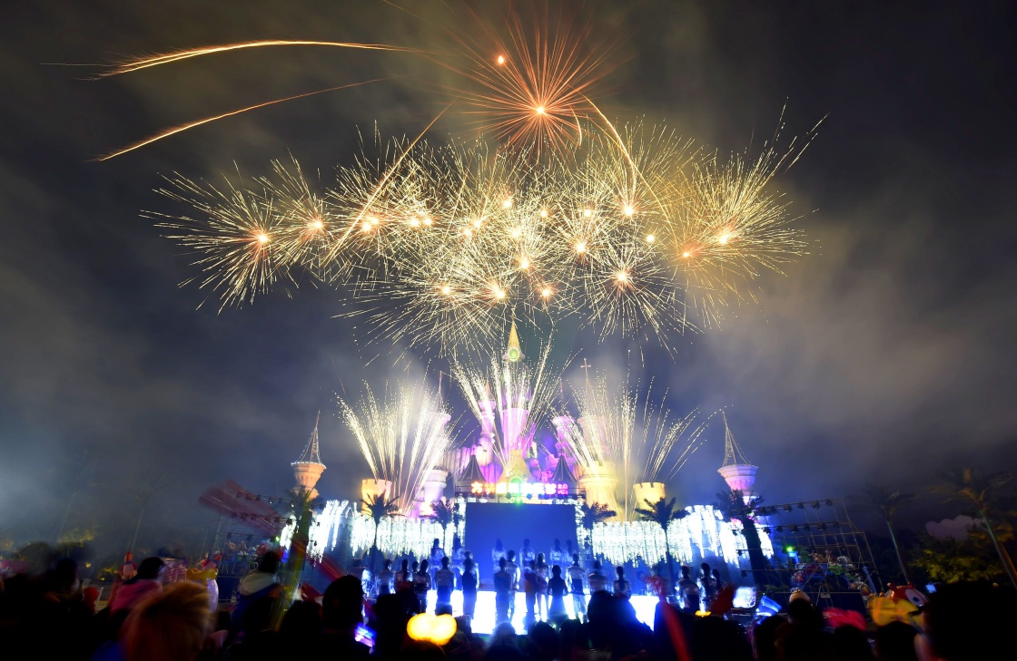 10月4日,沈阳市民来到方特欢乐世界观赏焰火表演,在绚丽的焰火下度过一个美妙的团圆夜。新华社发(龙雷 摄)
