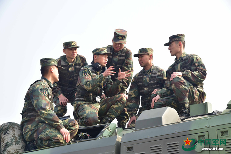 尹东正在与官兵们探讨问题(丁耀男摄影)